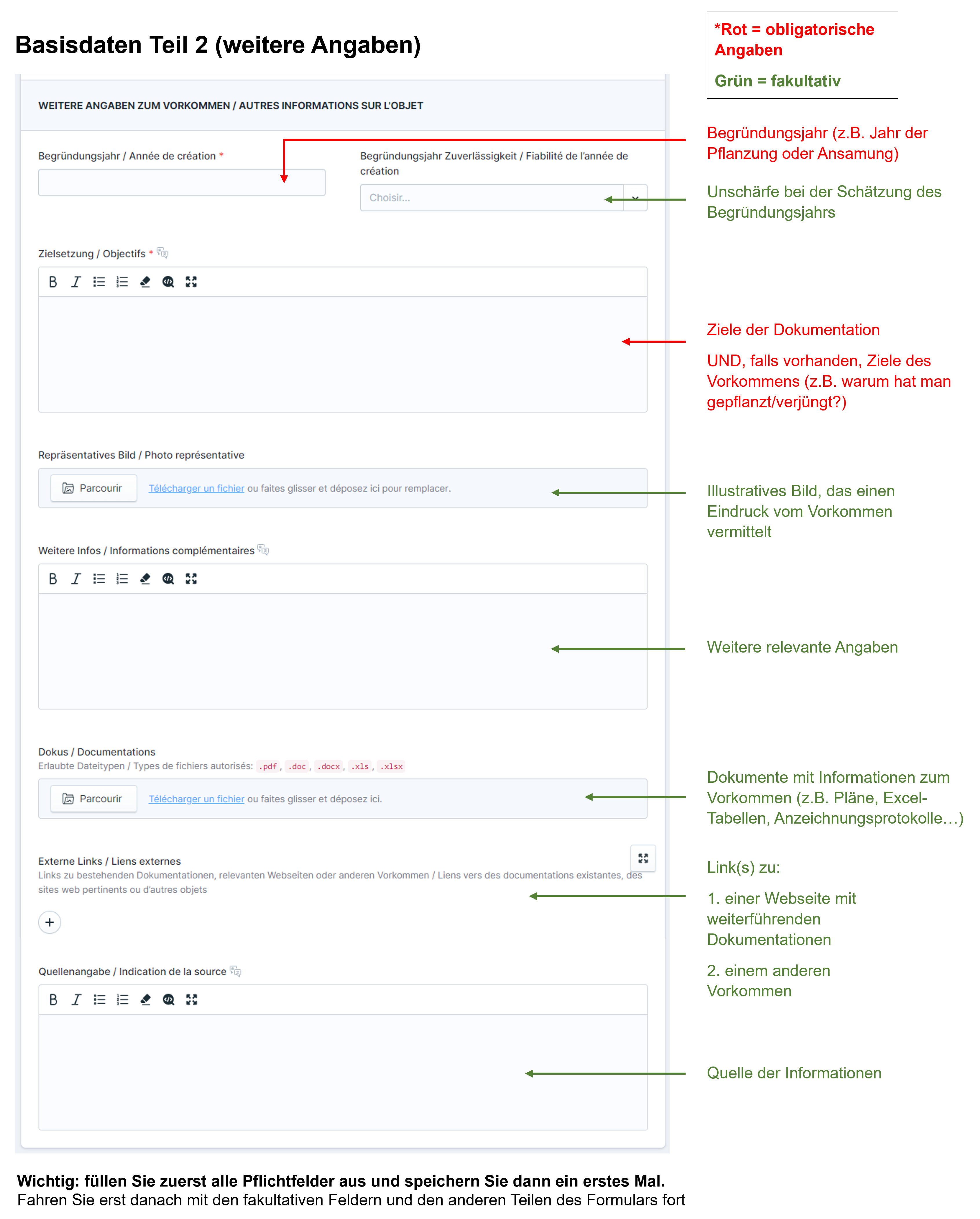 Es wird empfohlen, Felder möglichst nicht leer zu lassen, sondern auch dann auszufüllen, wenn nichts Besonderes passiert ist oder etwas nicht bekannt ist. Z.B. "Provenienz: unbekannt", "Gründe für Abgänge: unbekannt", oder "Wildschutzmassnahmen: keine", statt die Felder leer zu lassen.