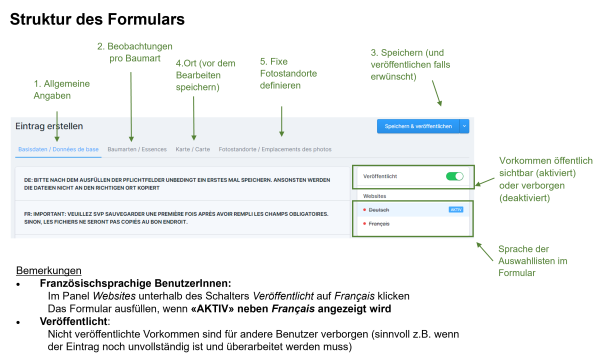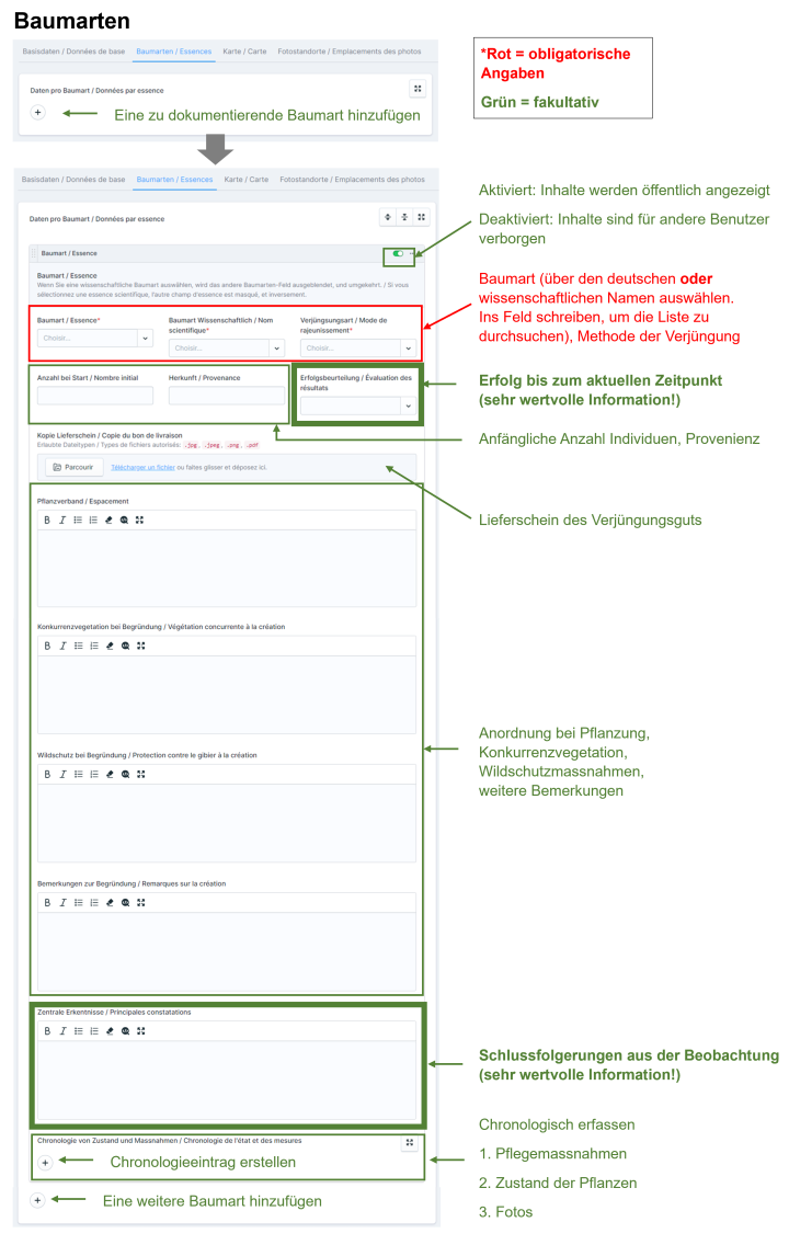 Ein Vorkommen kann mehrere Baumarten umfassen. Die Angaben und Beobachtungen werden für jede Baumart separat erfasst.